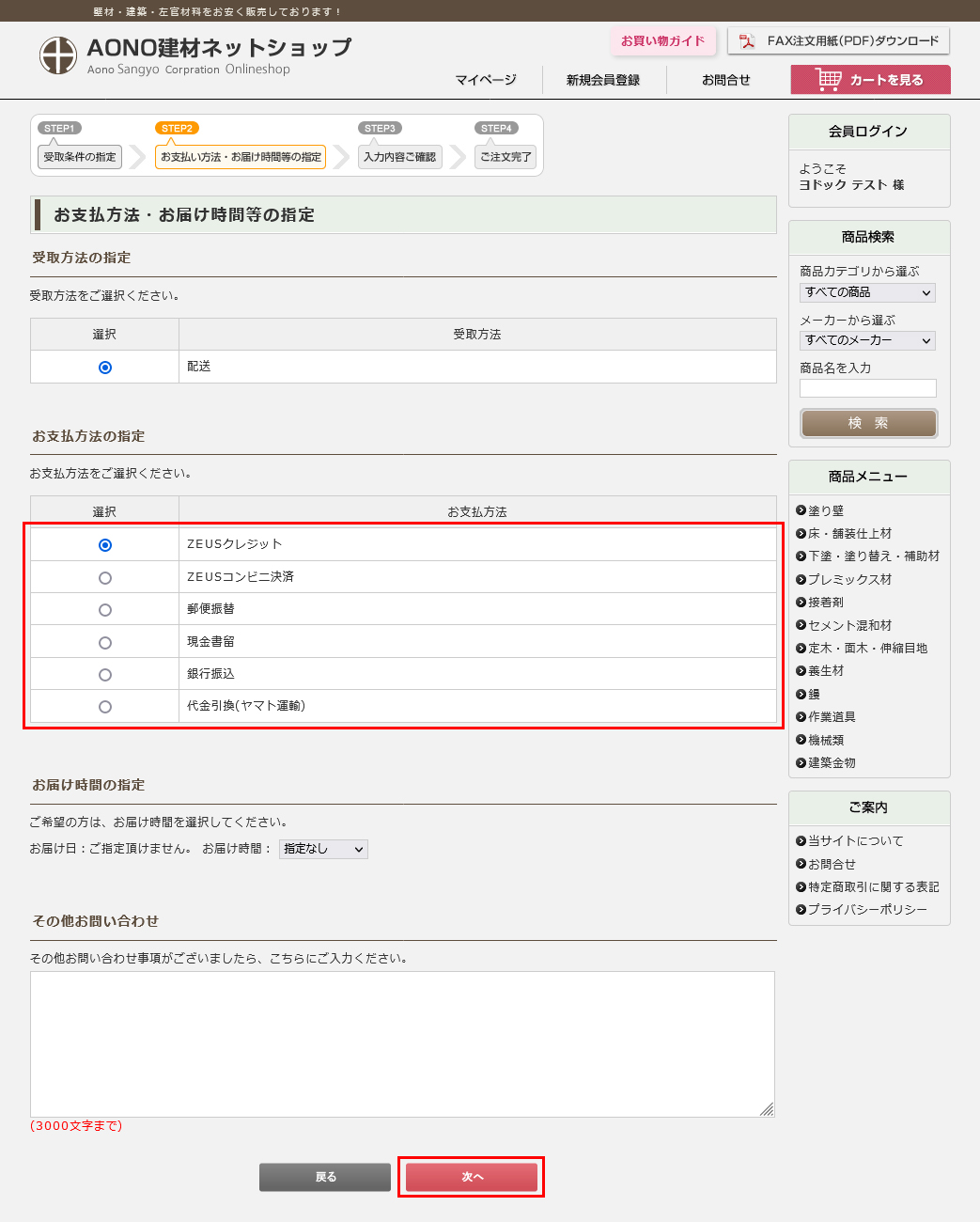 2. 購入する商品と、配送先の住所をご確認いただき、誤りがございませんでしたら「次へ」をクリックします。